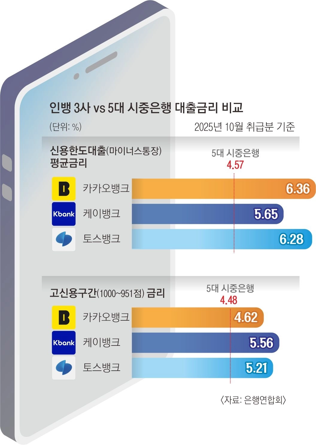 3일 은행연합회 소비자포털에 따르면 지난 10월 취급분 기준 신용한도대출(마이너스통장)의 평균금리는 카카오뱅크 6.36%, 케이뱅크 5.65%, 토스뱅크 6.28%로 집계됐다. 같은 기간 5대 시중은행(KB국민·신한·하나·우리·NH농협)의 평균은 4.57%였다. 인뱅 차주의 평균 신용점수가 낮은데다(카카오뱅크 851점·토스뱅크 827점), 한도대출 특성상 연체 위험이 크다는 점이 금리에 반영된 결과로 풀이된다.