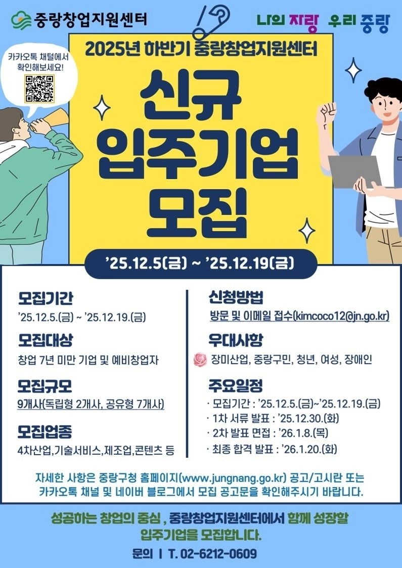 류경기 중랑구청장은 “혁신과 도전 정신을 가진 창업가들의 많은 참여를 기대한다”며 “중랑창업지원센터가 기업 성장의 든든한 기반이 되어 지역경제 활력으로 이어질 수 있도록 적극 지원하겠다”고 말했다.