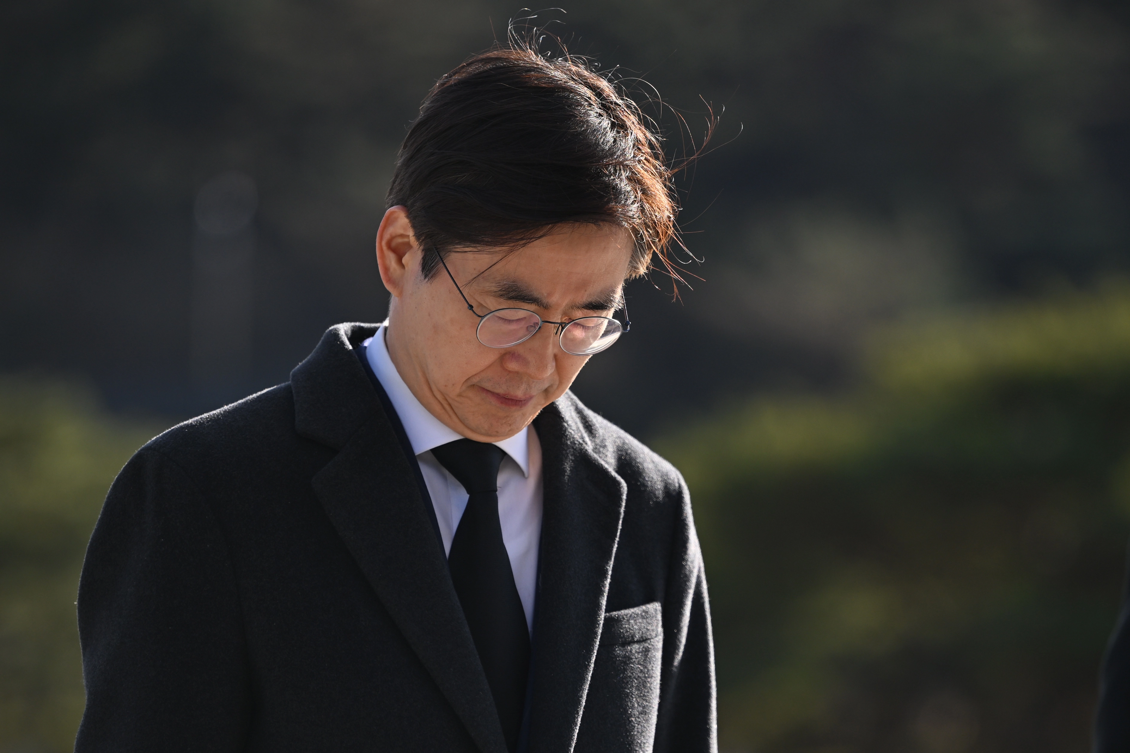 국민의힘 조경태 국회의원이 3일 오후 광주 북구 운정동 국립5·18민주묘지를 찾아 추념탑 앞에서 오월영령에 묵념하고 있다. 2025.12.03. 뉴시스