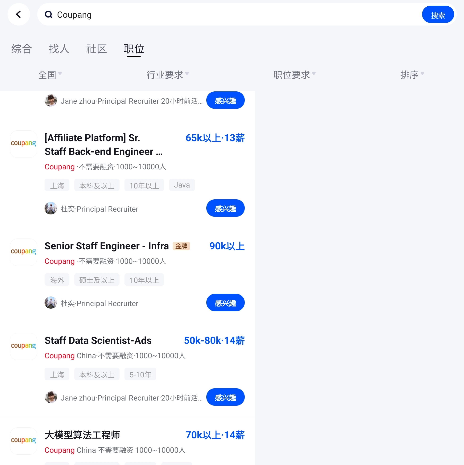 쿠팡 엔지니어 뽑는 중국 채용 사이트 “996없고, 근무강도 낮아”