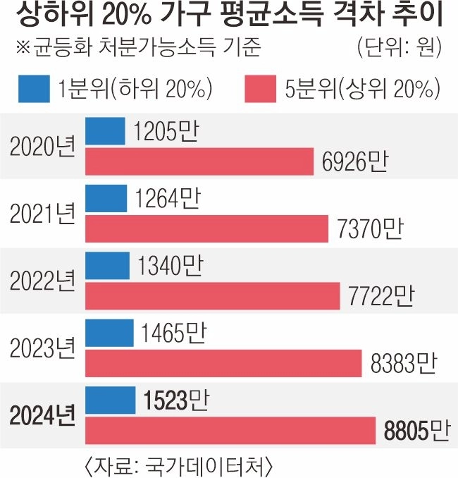 소득 격차가 확대된 만큼 ‘자산 양극화’도 한층 심화했다. 자산에서 부채를 뺀 순자산 5분위 가구의 평균 자산은 17억 4590만원으로 1분위(3890만원)의 44.9배에 달했다. 지난해(42.1배)보다 더 벌어진 수치다. 자산 불평등 정도를 보여 주는 순자산 지니계수는 0.625로 2012년 통계 작성 이후 가장 높았다.