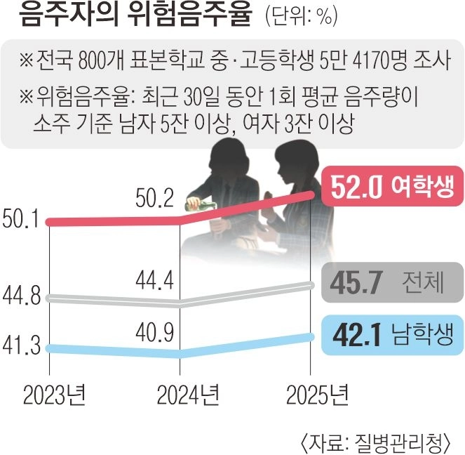 질병관리청이 4일 발표한 ‘2025 청소년건강행태조사’에 따르면 최근 한 달간 술을 마신 여학생의 52.0%가 ‘위험 음주’에 해당해 남학생(42.1%)보다 높았다. 위험 음주는 최근 30일간 1회 평균 음주량이 소주 기준 남학생 5잔 이상, 여학생 3잔 이상일 때를 말한다.