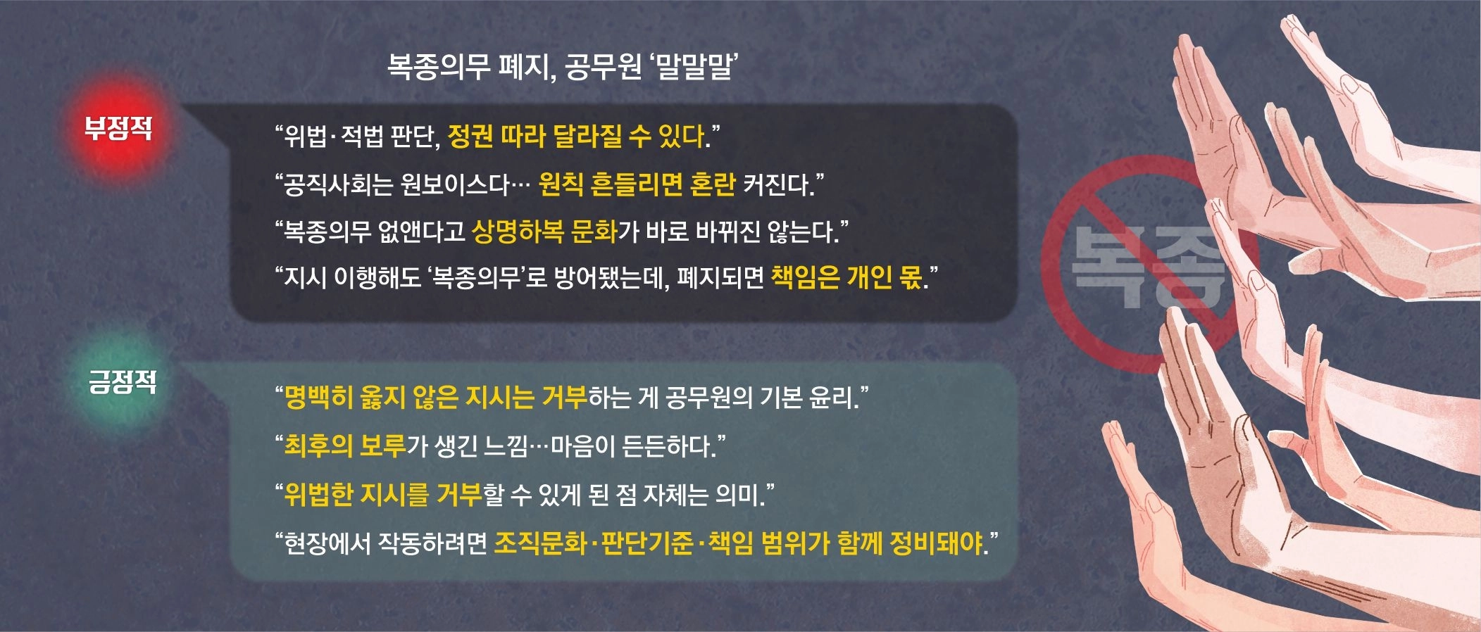 경제부처 서기관 B씨는 계엄 사태 이후 공직사회의 분위기를 언급하며 “상사의 지시를 메모하거나 녹취해두는 문화가 확산했다”고 말했다. 그는 “이미 ‘개인 책임의 시대’를 대비하고 있었던 만큼 복종 의무 폐지가 상징 이상의 의미를 갖는지는 의문”이라고 말했다. 같은 부처의 사무관 B씨는 “지시와 책임의 체계가 있어야 조직이 굴러간다”며 “복종 의무는 불합리해 보일 수 있지만 조직 운영의 장치이기도 하다”고 말했다.