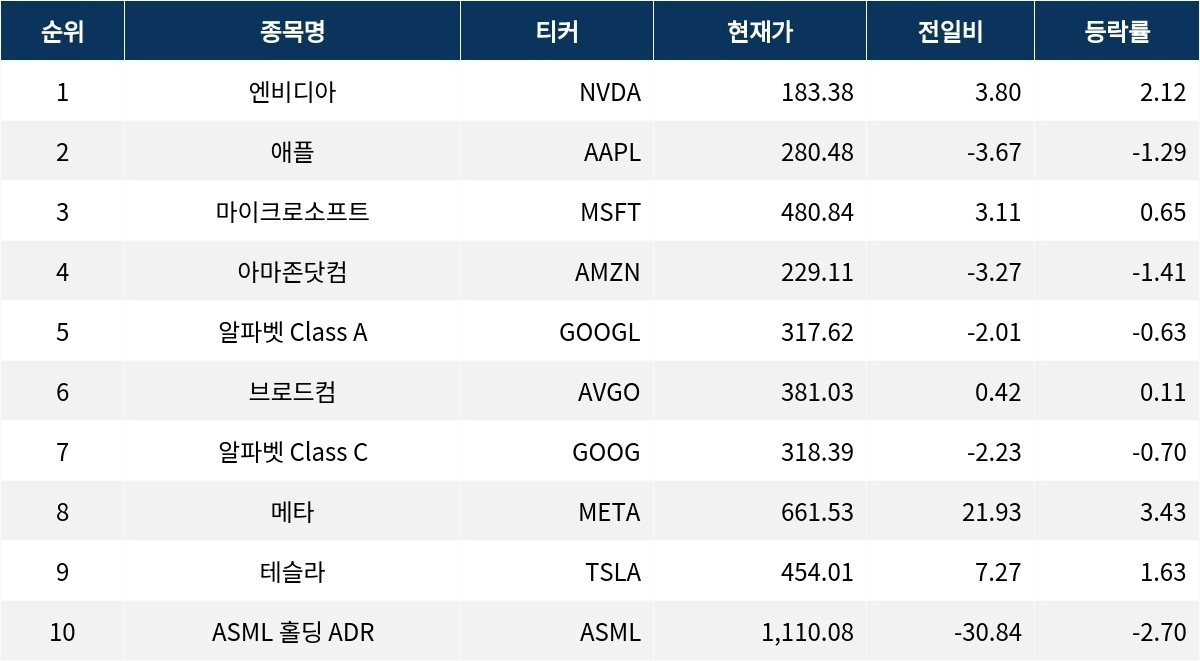 애플은 1.29% 하락한 280.48달러를 기록했다. 아마존닷컴은 1.41% 하락하여 229.11달러로 마감했다. 알파벳 Class A(GOOGL)는 0.63% 하락, 알파벳 Class C(GOOG)는 0.70% 하락하며 보합세를 기록했다. 브로드컴(AVGO)은 0.11% 상승하며 보합세를 유지했다.