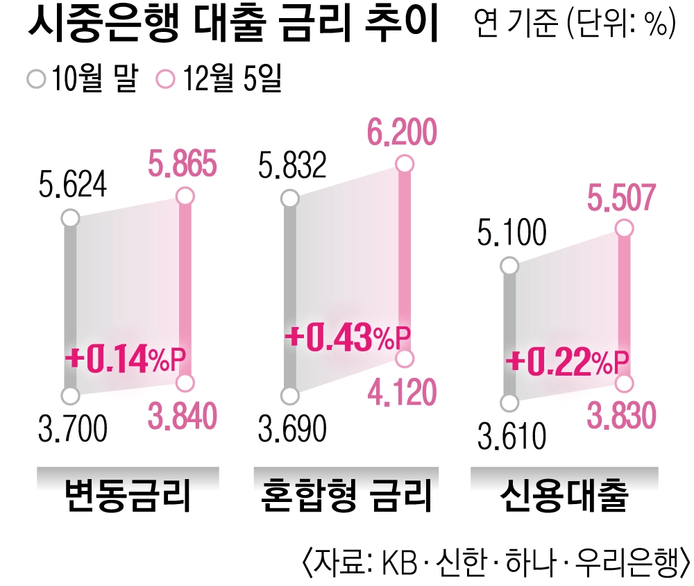 신용대출 금리 역시 급등세다. 한 달 새 금리 상단은 5.1%에서 5.507%로 0.407% 포인트 올랐다. 11월 신용대출이 마이너스통장을 중심으로 4년 4개월 만의 최대 증가폭을 기록한 상황에서, 최근 빚을 낸 차주들의 부담은 더욱 커지고 있다.