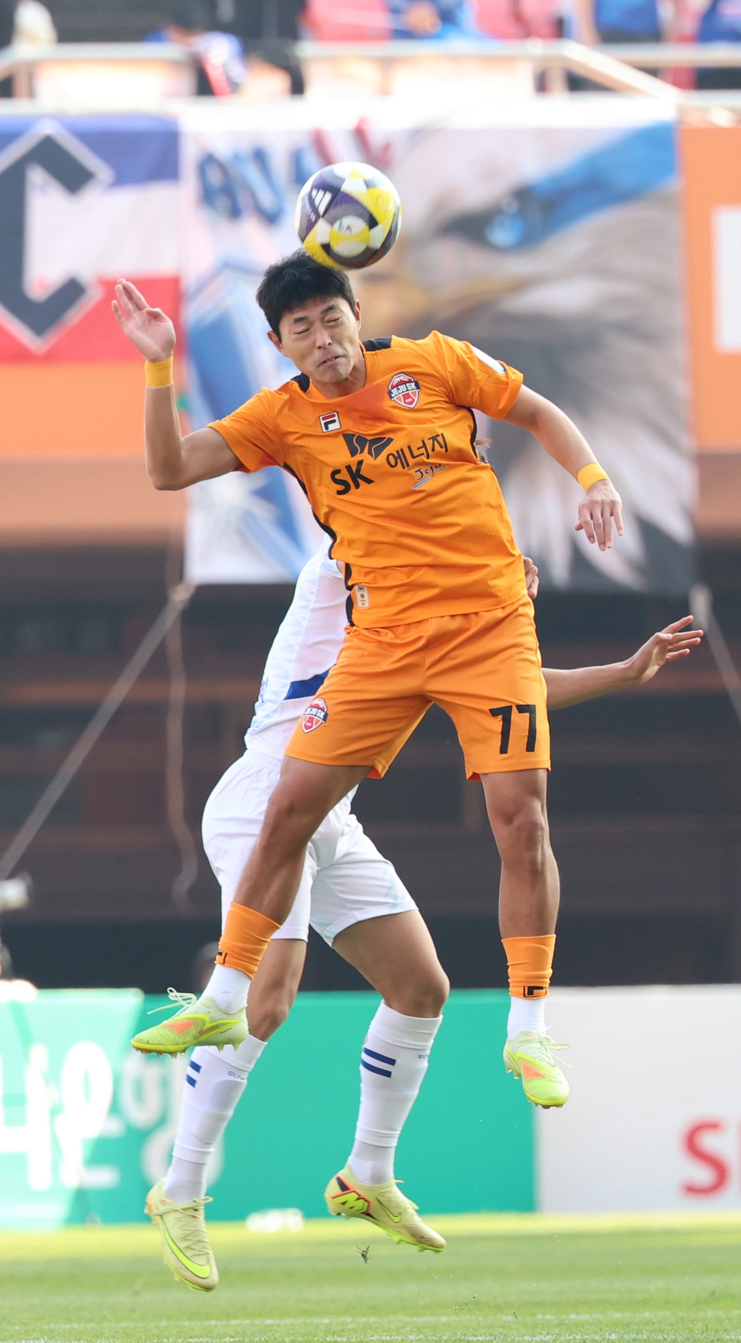 프로축구 제주SK 김승섭이 7일 서귀포월드컵경기장에서 열린 K리그 승강 플레이오프(PO) 수원 삼성과의 2차전에서 헤딩으로 공을 따내고 있다. 전반 시작 55초 만에 김승섭이 선제골을 넣은 제주는 수원을 2-0으로 누르고 K리그1 잔류에 성공했다. 서귀포 연합뉴스