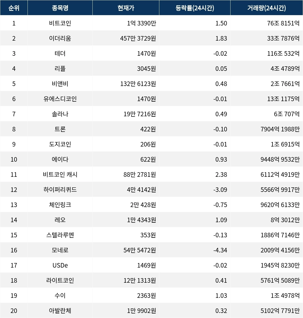 한편, 솔라나는 19만 7216원에 거래되며 24시간 동안 0.49% 상승했다. 거래량은 6조 707억 원이다. 같은 시각 트론은 422원으로 0.10% 하락했다. 거래량은 7904억 1988만 원이다. 도지코인은 206원에 거래되며 0.01% 하락했다. 거래량은 1조 6915억 원이다.