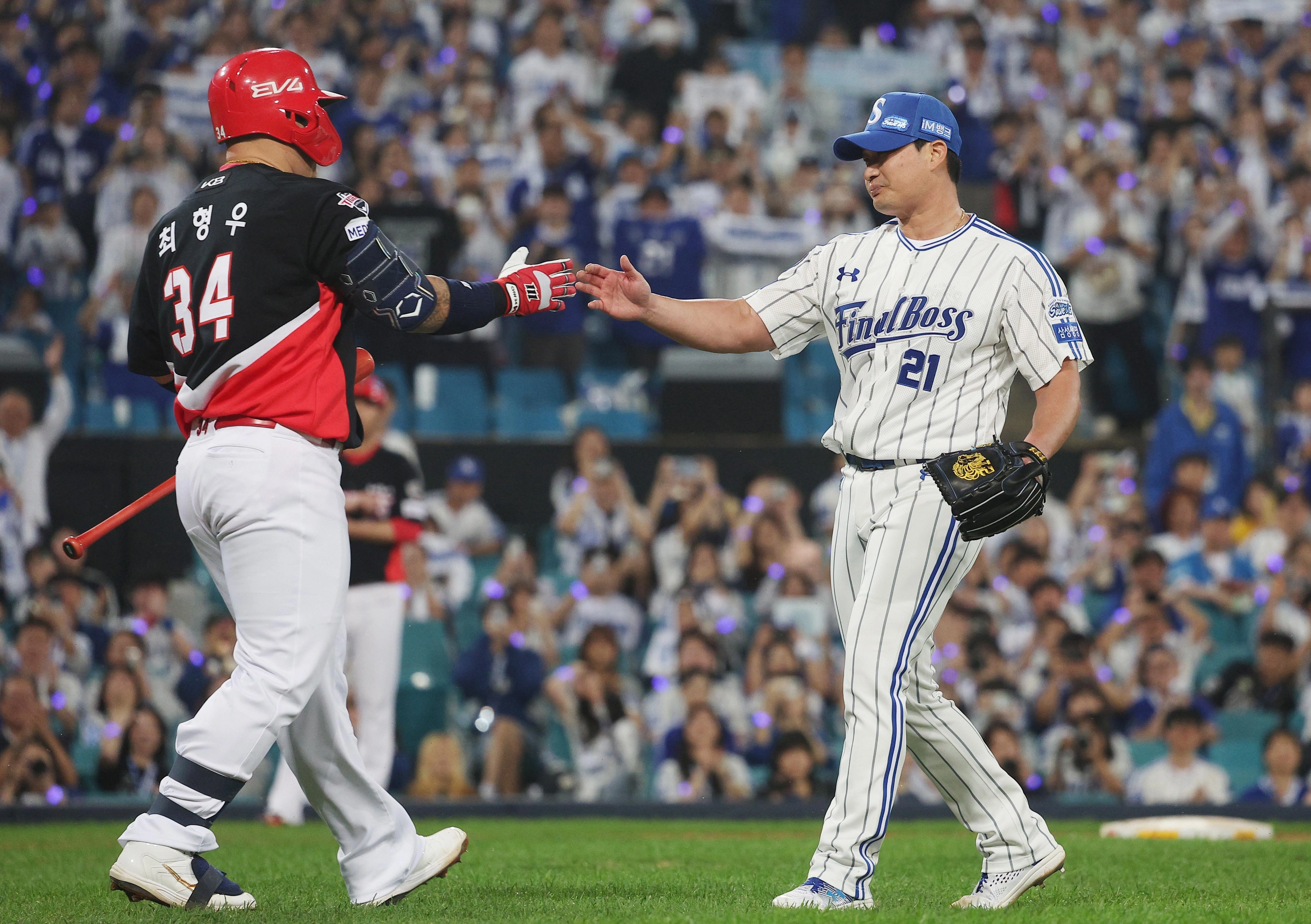 마지막 마운드 끝낸 오승환 30일 대구 삼성라이온즈파크에서 열린 KIA와 삼성의 경기. 9회 초 이날 은퇴식을 하는 삼성의 마무리투수 오승환이 마운드에서 역투를 끝내고 타석에 있던 KIA 최형우와 인사하고 있다. 2025.9.30 대구 연합뉴스