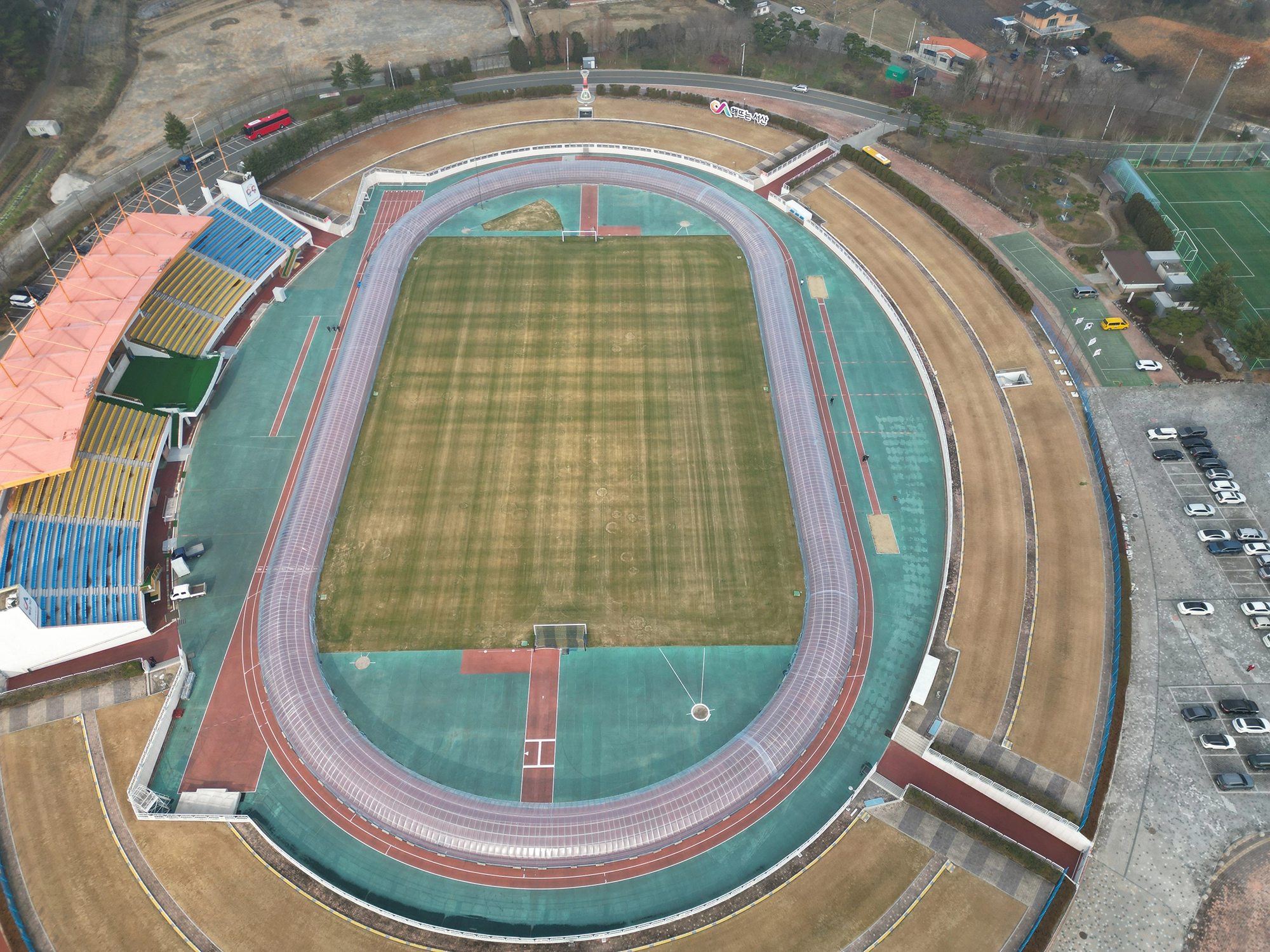 비닐하우스가 설치된 충남 서산시 종합운동장 주 경기장 육상트랙장. 서산시 제공