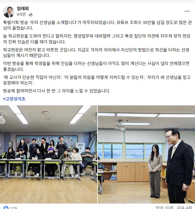 임 교육감은 9일 자신의 사회관계망서비스(SNS)에 “‘우리 선생님을 소개합니다’ 방송에 유튜브 조회수 30만을 넘길 정도로 많은 관심이 쏠렸다”라고 글을 시작했다.