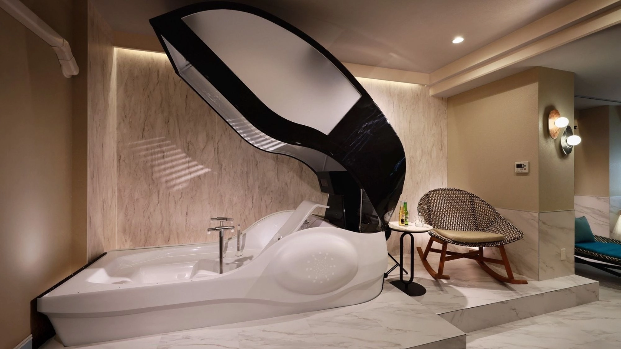 길이 2.3m 캡슐 안에서 누워있기만 하면 미세한 거품이나 안개 형태의 샤워가 때를 씻어내고 15분 만에 몸을 말려주기까지 한다. 목욕 도중에는 후면 센서가 이용자의 건강 상태를 감지하며, 음악과 영상도 감상할 수 있다.