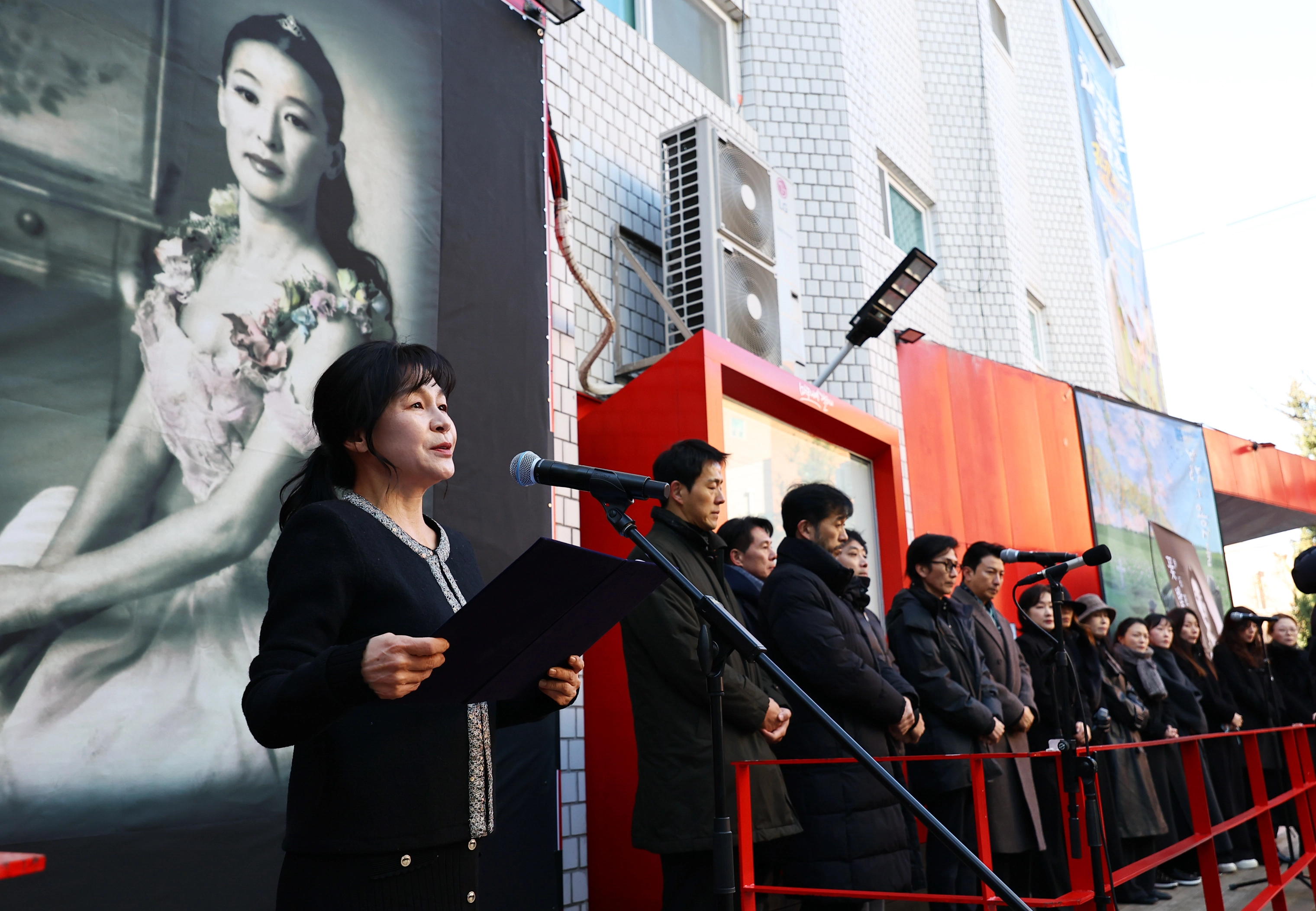 21일 서울 종로구 대학로 한예극장(옛 정미소) 앞마당에서 엄수된 고 윤석화의 노제에서 길해연 한국연극인복지재단 이사장이 슬픔에 겨운 듯 떨리는 목소리로 추도사를 이어갔다. 동료 예술인들은 곳곳에서 흐느꼈고, 고인과 평소 자매처럼 지냈던 배우 박정자와 손숙은 손수건으로 연신 눈물을 닦았다.