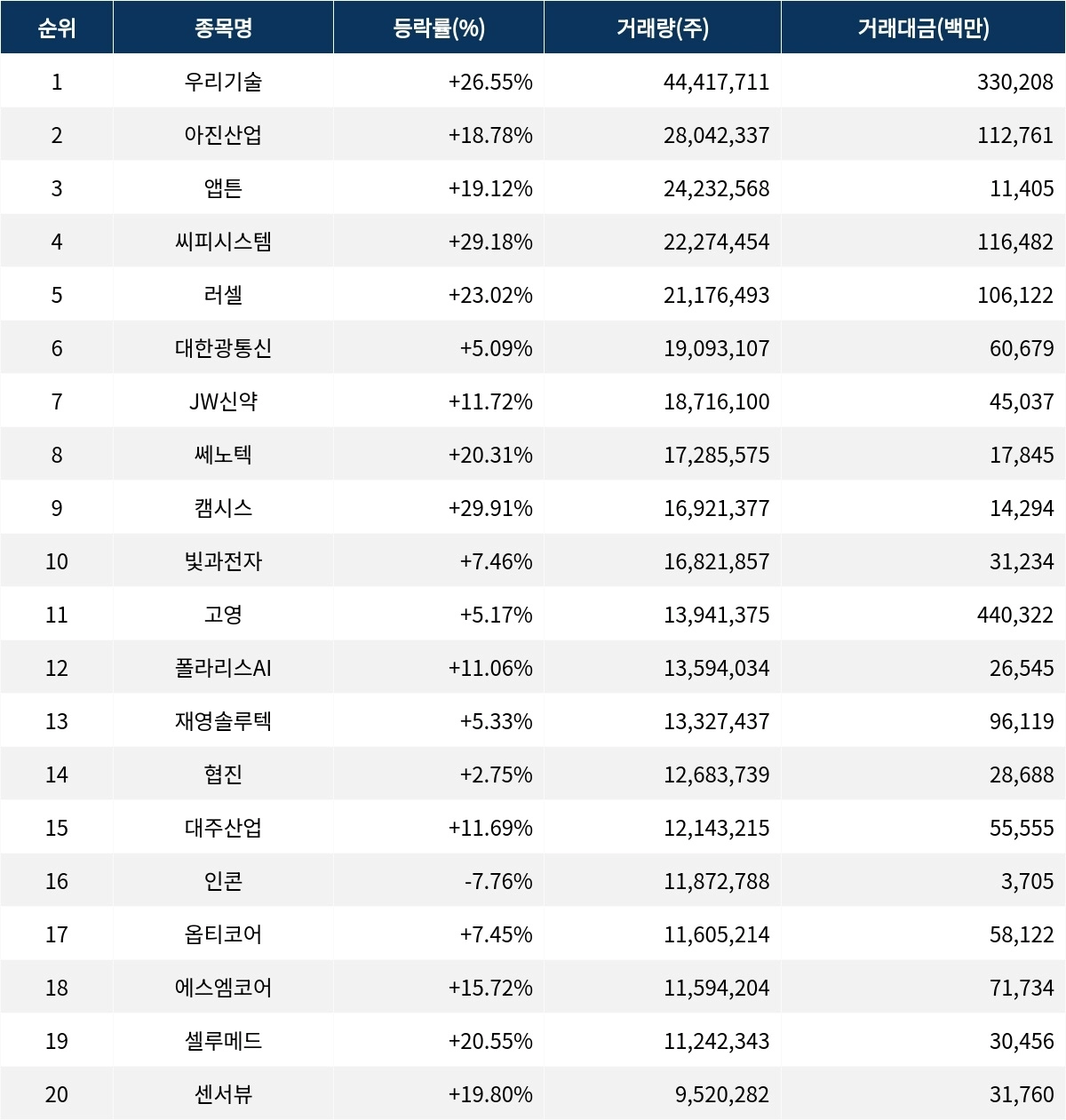 한편, 거래량 상위 20위권 종목들은 고영(098460) ▲5.17%, 폴라리스AI(039980) ▲11.06%, 재영솔루텍(049630) ▲5.33%, 협진(138360) ▲2.75%, 대주산업(003310) ▲11.69%, 인콘(083640) ▼-7.76%, 옵티코어(380540) ▲7.45%, 에스엠코어(007820) ▲15.72%, 셀루메드(049180) ▲20.55%, 센서뷰(321370) ▲19.80% 등의 성적을 기록했다.