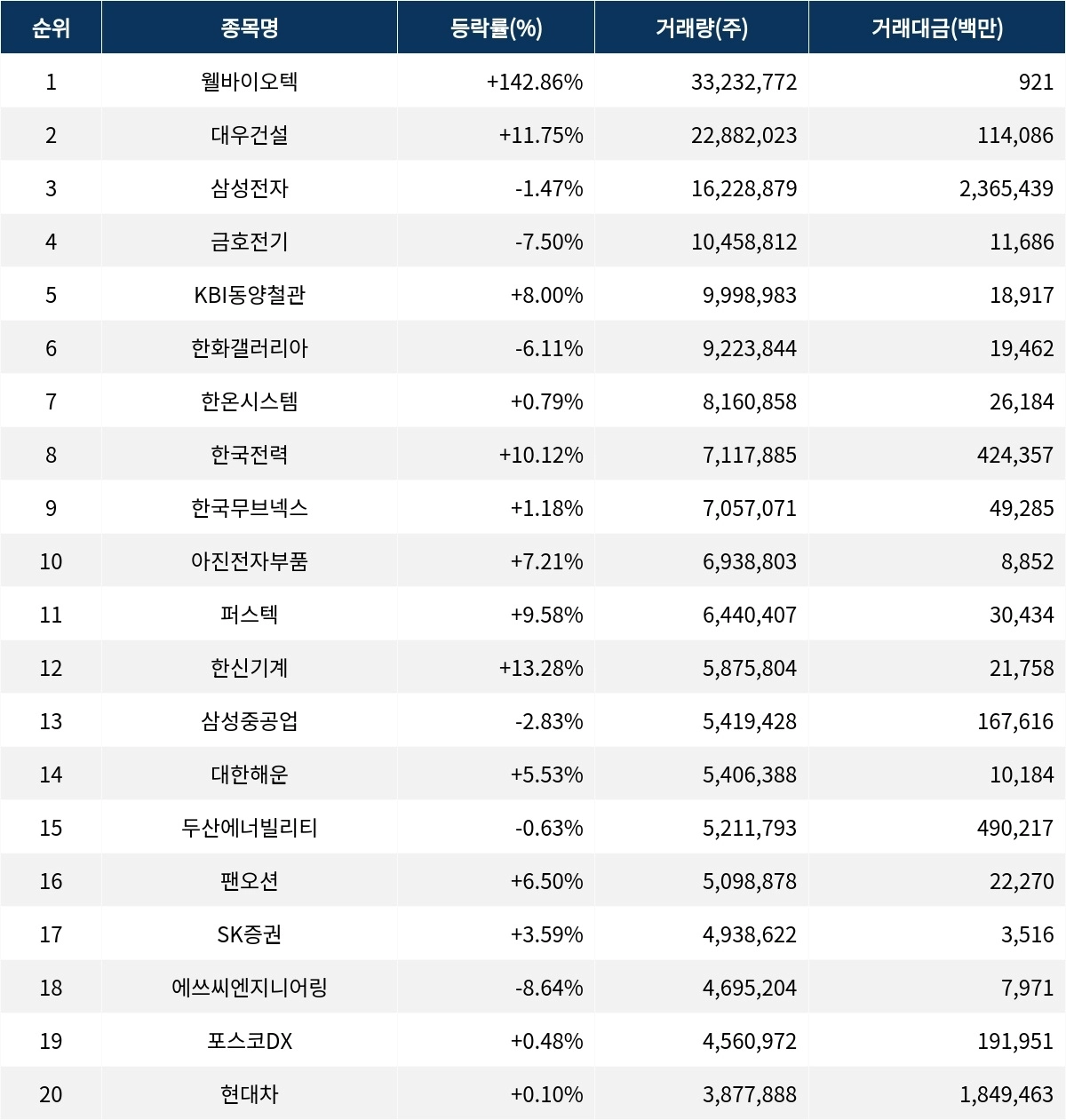 한편 거래량 상위 20위권 종목들은 퍼스텍(010820) ▲9.58%, 한신기계(011700) ▲13.28%, 삼성중공업(010140) ▼2.83%, 대한해운(005880) ▲5.53%, 두산에너빌리티(034020) ▼0.63%, 팬오션(028670) ▲6.50%, SK증권(001510) ▲3.59%, 에쓰씨엔지니어링(023960) ▼8.64%, 포스코DX(022100) ▲0.48%, 현대차(005380) ▲0.10% 등의 성적을 기록했다.