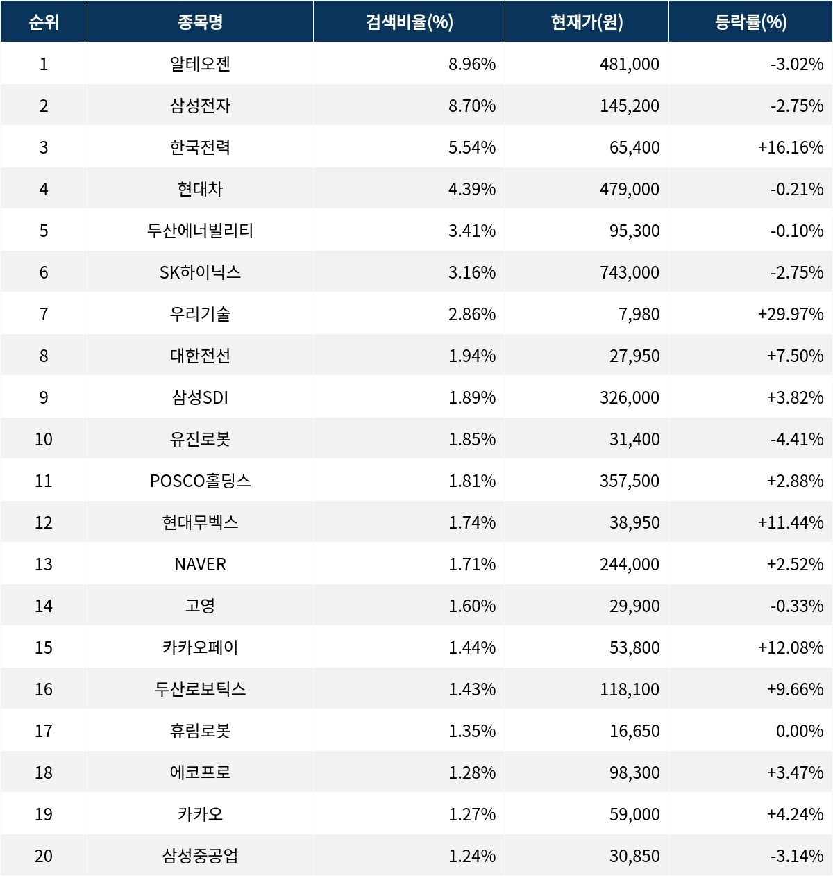 이어 검색비율 2위의 삼성전자(005930)는 등락률 -2.75%로 하락 마감했다. 검색비율 3위의 한국전력(015760)은 16.16% 급등 마감했다. 검색비율 4위 현대차(005380)는 0.21% 하락으로 보합세를 기록했다. 검색비율 5위 두산에너빌리티(034020)는 0.10% 하락하며 보합세로 마감했다.