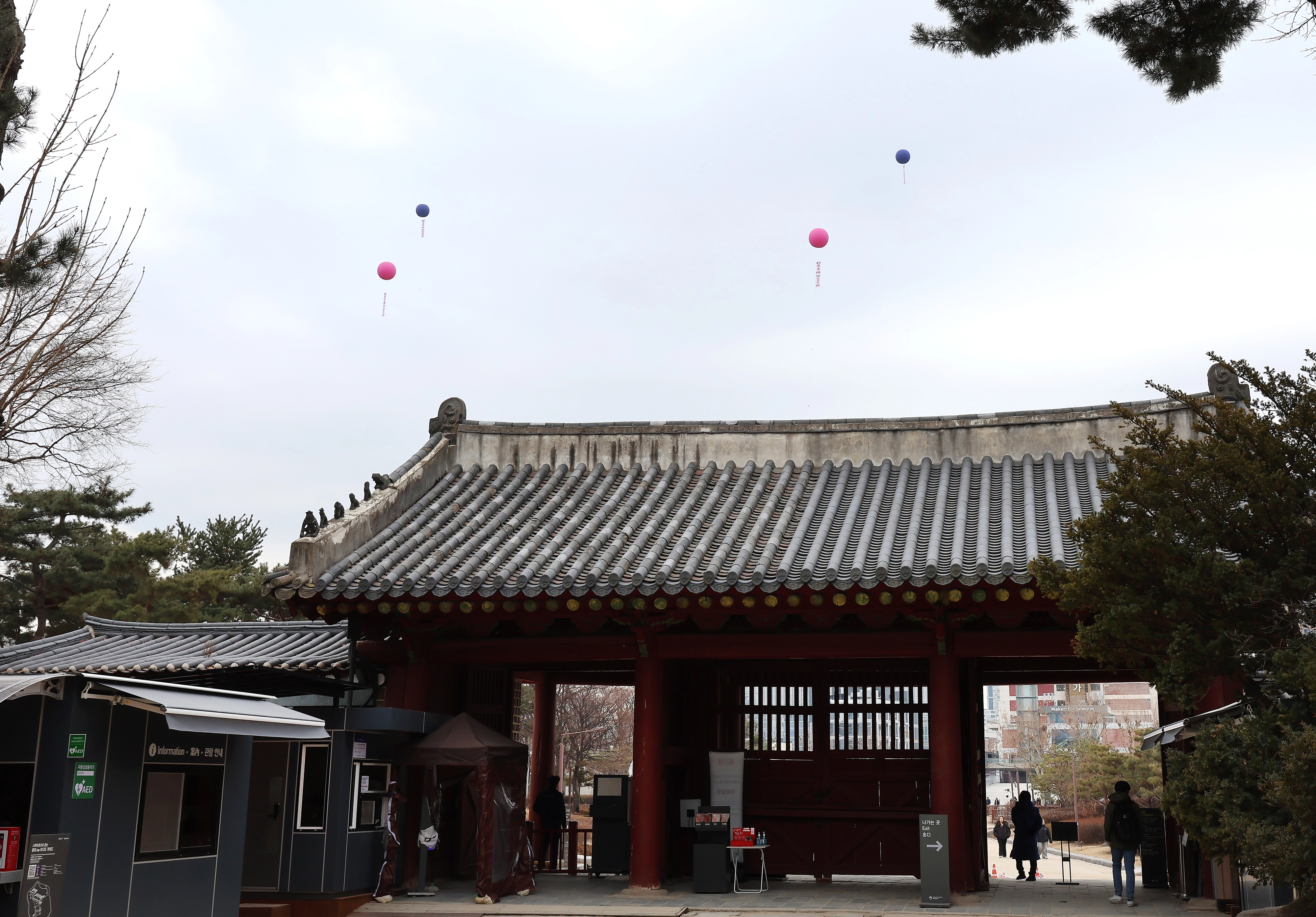 지난 9일 서울 종묘 입구에서 재개발로 지어질 세운4구역 내 고층 건물과 비슷한 높이의 서울시가 띄운 애드벌룬이 보인다.