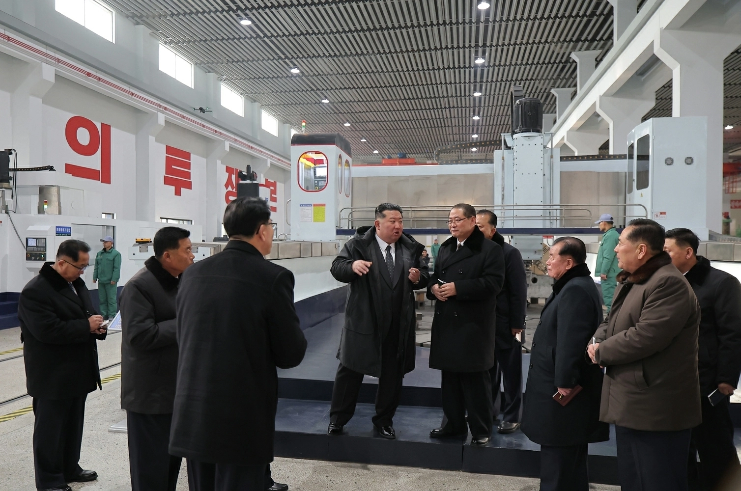김정은 북한 국무위원장이 지난 19일 기간산업 설비 생산 공장의 현대화 준공식에 참석해 공장을 시찰하고 있다. 북한 노동당 기관지 노동신문은 20일 “룡성기계연합기업소 1단계 개건(리모델링) 현대화 대상 준공식이 1월 19일 진행됐다”고 전하며 이 사진을 공개했다. 김 위원장은 이날 준공식에서 공장 현대화 차질을 강하게 질타하고 기계공업을 담당하는 양승호 내각 부총리를 현장에서 해임했다. 함흥 노동신문 뉴스1