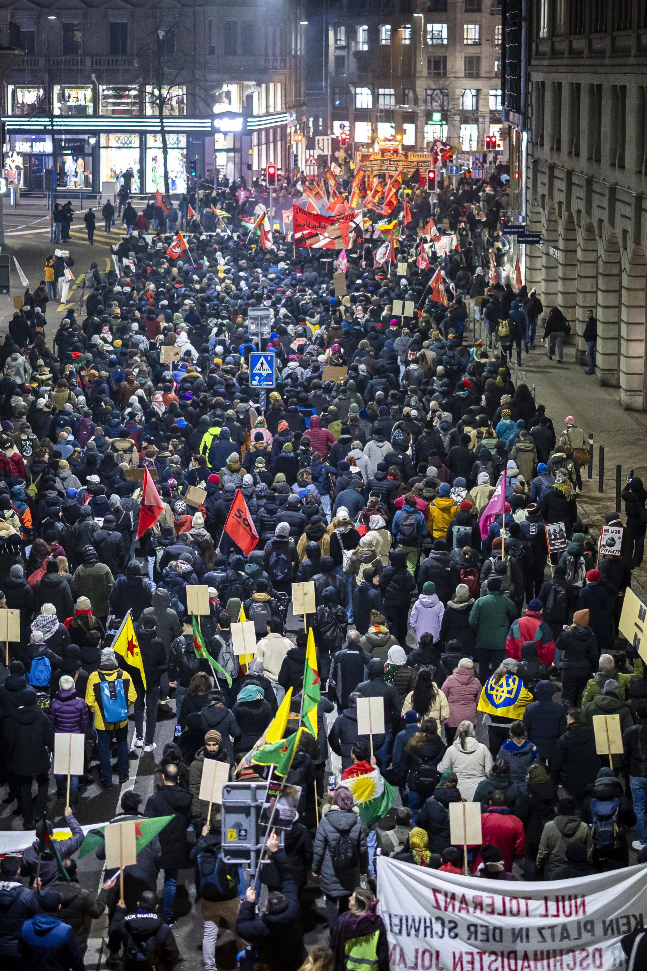 19일(현지시간) 스위스 휴양지 다보스에서 세계경제포럼(WEF·다보스포럼)이 개막한 가운데 같은 날 스위스 취리히에서 다보스포럼과 도널드 트럼프 미국 대통령의 스위스 방문에 반대하는 집회가 열리고 있다. ‘대화의 정신’을 주제로 한 이번 포럼에서는 기후 위기 대응 등 지구촌 의제보다 트럼프 대통령이 촉발한 ‘그린란드 논란’ 등 미국의 외교 정책이 핵심 의제로 부상했다. 트럼프 대통령은 21일 특별 연설에 나선다.