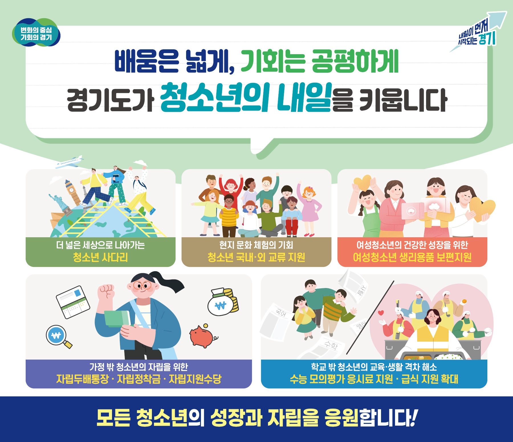 경기도가 올해 청소년의 건강한 성장과 배움 기회, 생활 안정을 위해 급식, 학습·진로·자립 지원을 아우르는 다양한 정책을 추진한다.