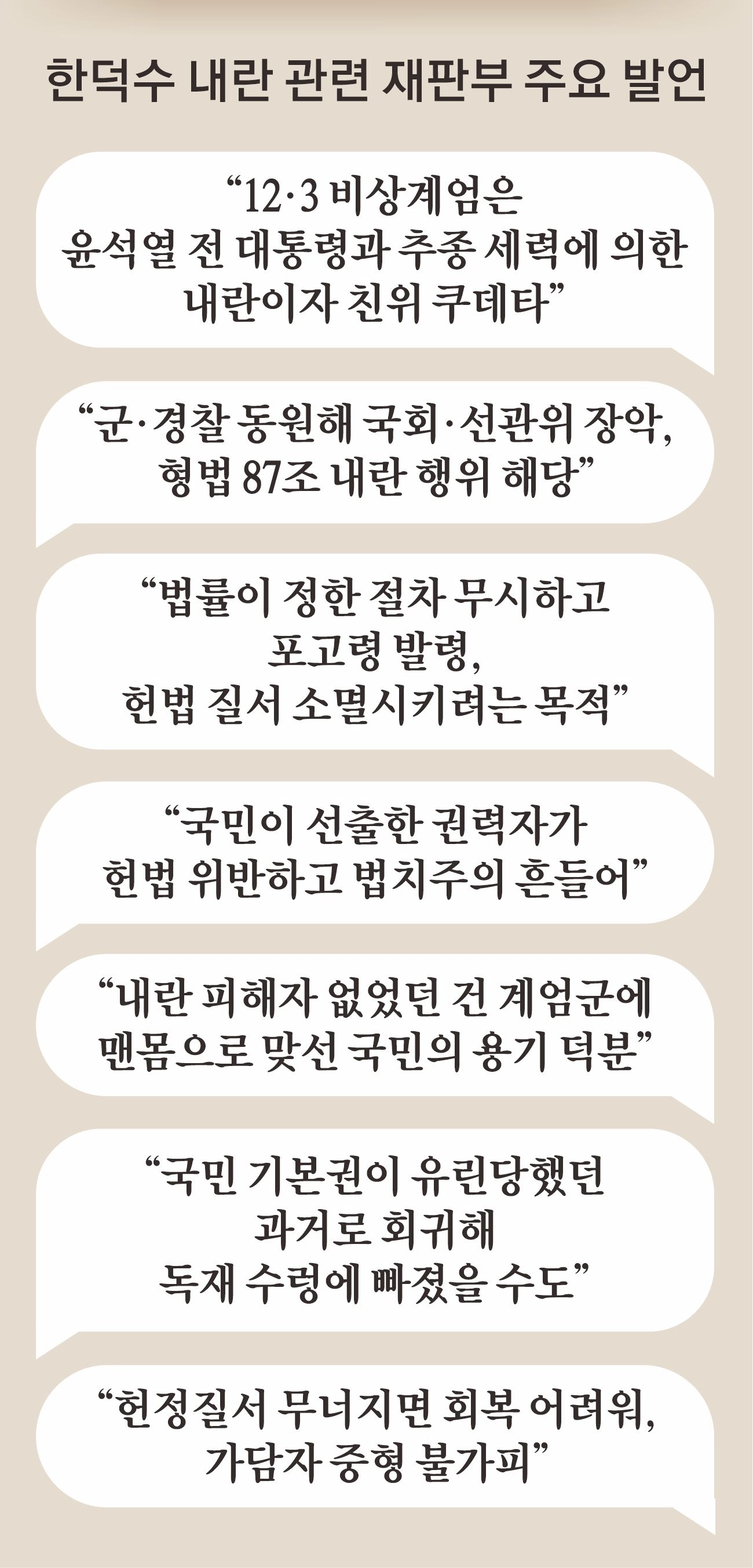 재판부가 한 전 총리를 내란죄의 ‘필요적(필수적) 공범’으로 인정하면서 사실상 윤 전 대통령의 ‘내란 우두머리’ 혐의도 성립하게 됐다는 해석이 나온다. 또 법원이 12·3 비상계엄의 죄질이 무겁다는 점을 거듭 강조한 만큼 윤 전 대통령에게 특검이 구형한 사형이 실제 선고될 가능성이 제기된다. 내란 우두머리 혐의의 법정형은 사형, 무기징역 또는 무기금고 세 가지뿐이다.
