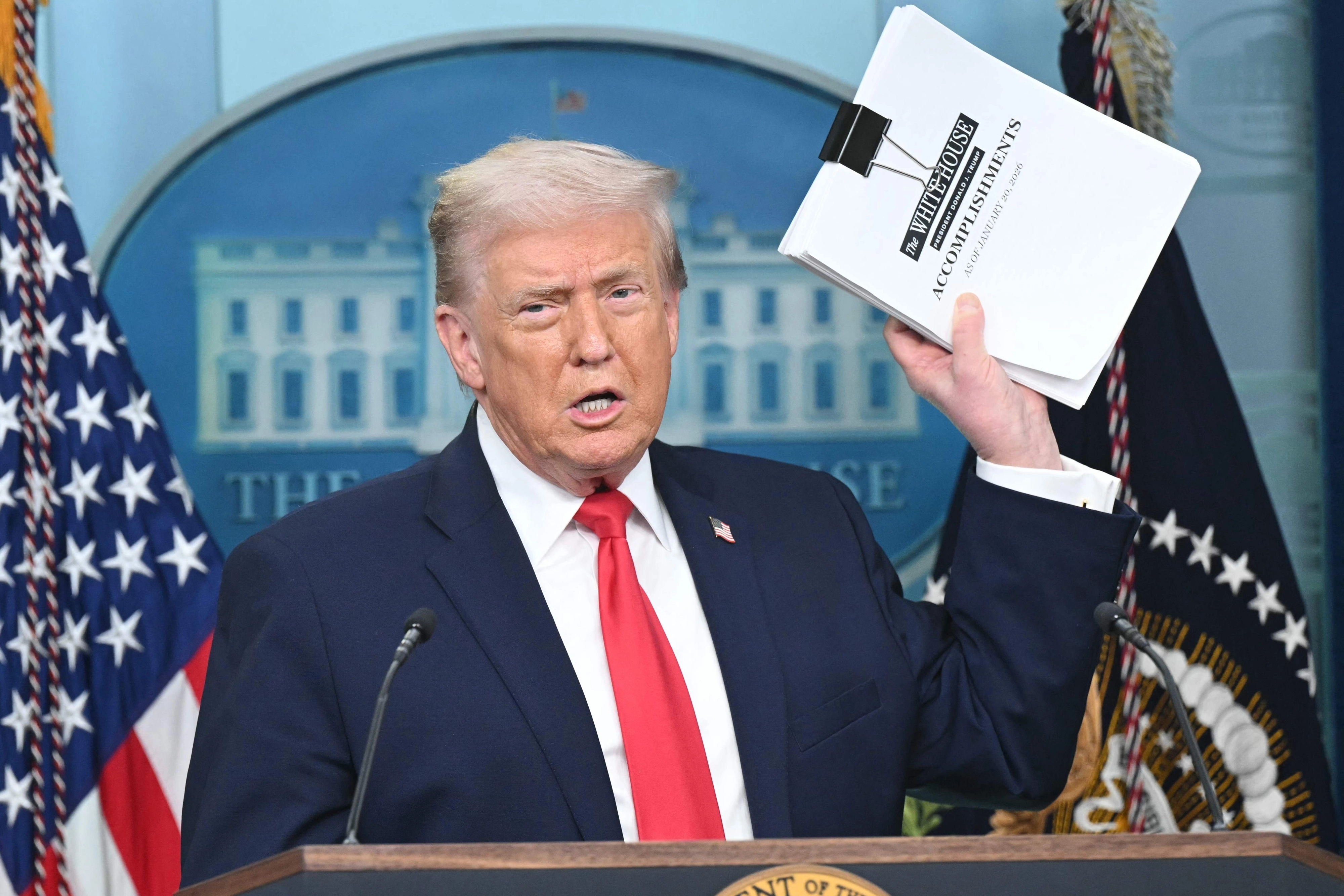 도널드 트럼프 미국 대통령이 20일(현지시간) 워싱턴DC 백악관에서 열린 기자회견에서 집권 2기 취임 1년의 성과를 정리한 ‘업적’이라고 쓰인 두꺼운 문서 묶음을 들어 보이고 있다. 워싱턴DC AFP 연합뉴스