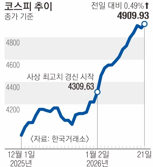 21일 한국거래소에 따르면 코스피는 전 거래일 대비 24.18포인트(0.49%) 오른 4909.93에 마감했다. 종가 기준 최고치다. 지수는 장 초반 도널드 트럼프 미국 대통령의 ‘그린란드 관세’ 압박으로 미·유럽 무역 갈등 우려가 부각되며 4807.13까지 밀렸지만, 오후 들어 반등에 성공했다. 유가증권시장에서 외국인은 4394억원, 기관은 3219억원을 각각 순매수하며 지수를 끌어올렸고 개인은 9965억원을 순매도했다.