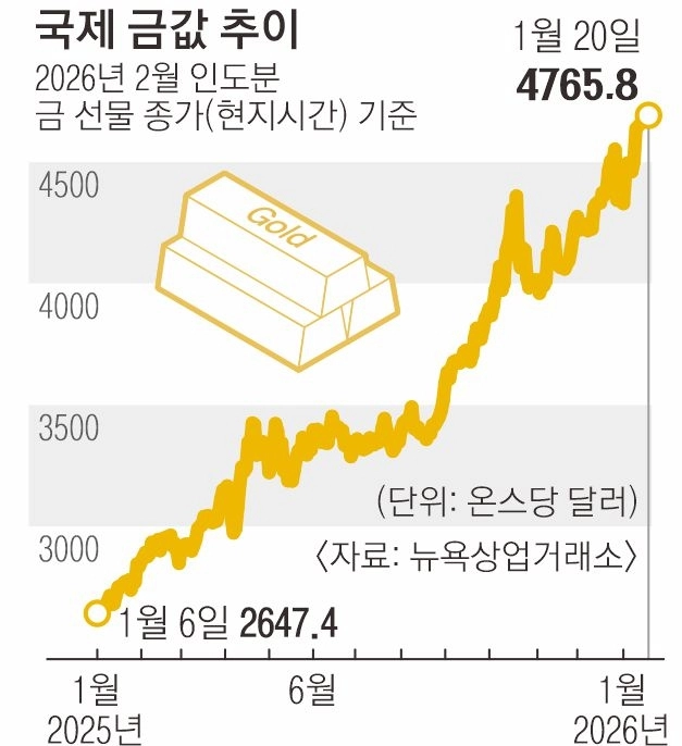 주식시장이 변동성에 노출된 사이, 국제 금값은 안전자산 선호가 강화되며 급등했다. 20일(현지시간) 뉴욕상업거래소에서 2월 인도분 금 선물 가격은 온스당 4765.8달러로 마감해 사상 최고치를 경신했다. 미·유럽 간 갈등이 장기화할 수 있다는 우려가 커지면서 위험자산 회피 심리가 금 시장으로 쏠린 영향으로 풀이된다.