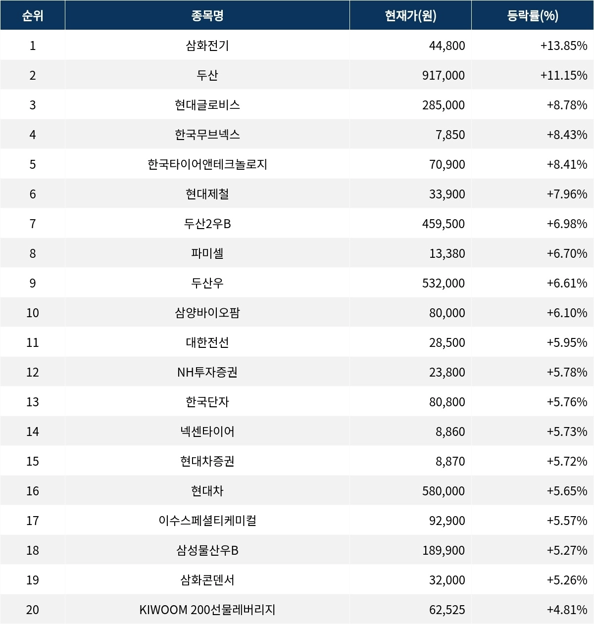 6위 현대제철(004020)은 현재가 3만 3900원으로 7.96% 상승 중이다. 7위 두산2우B(000157)는 현재가 45만 9500원으로 6.98% 상승 중이다. 8위 파미셀(005690)은 현재가 1만 3380원으로 6.70% 상승 중이다. 9위 두산우(000155)는 현재가 53만 2000원으로 6.61% 상승 중이다. 10위 삼양바이오팜(0120G0)은 현재가 8만 원으로 6.10% 상승 중이다.