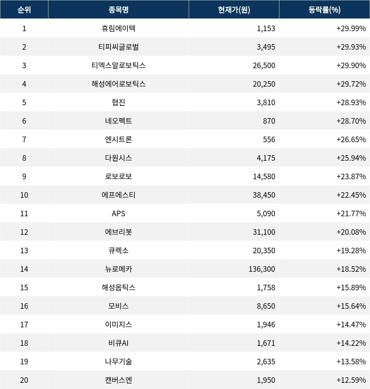 이밖에도 APS(054620) ▲21.77%, 에브리봇(270660) ▲20.08%, 큐렉소(060280) ▲19.28%, 뉴로메카(348340) ▲18.52%, 해성옵틱스(076610) ▲15.89%, 모비스(250060) ▲15.64%, 이미지스(115610) ▲14.47%, 비큐AI(148780) ▲14.22%, 나무기술(242040) ▲13.58%, 캔버스엔(210120) ▲12.59% 등을 기록하며 시장에서 활발히 거래되고 있다.