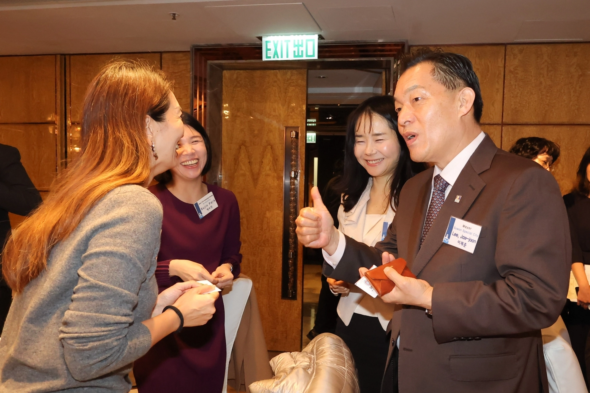 이재준 수원시장이 21일(현지 시각) 홍콩 현지 투자유치설명회에서 참석자들과 대화를 나누고 있다. (수원시 제공)