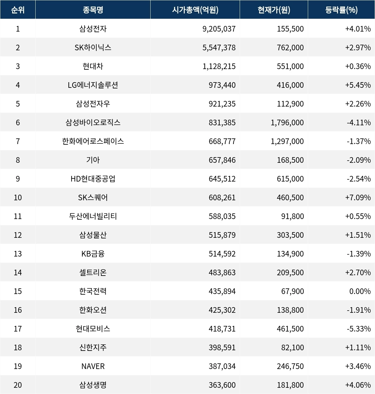 한편 시가총액 20위권 종목들은 두산에너빌리티(034020) +0.55%, 삼성물산(028260) +1.51%, KB금융(105560) ▼1.39%, 셀트리온(068270) +2.70%, 한국전력(015760) 0.00%, 한화오션(042660) ▼1.91%, 현대모비스(012330) ▼5.33%, 신한지주(055550) +1.11%, NAVER(035420) +3.46%, 삼성생명(032830) +4.06% 등의 성적을 기록하고 있다.