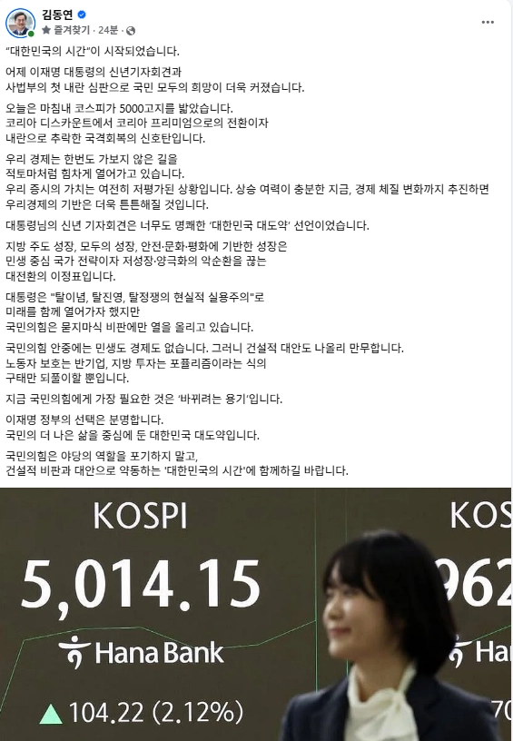 이어 “오늘은 마침내 코스피가 5000 고지를 밟았다. 코리아 디스카운트에서 코리아 프리미엄으로의 전환이자 내란으로 추락한 국격 회복의 신호탄”이라고 평가했다.