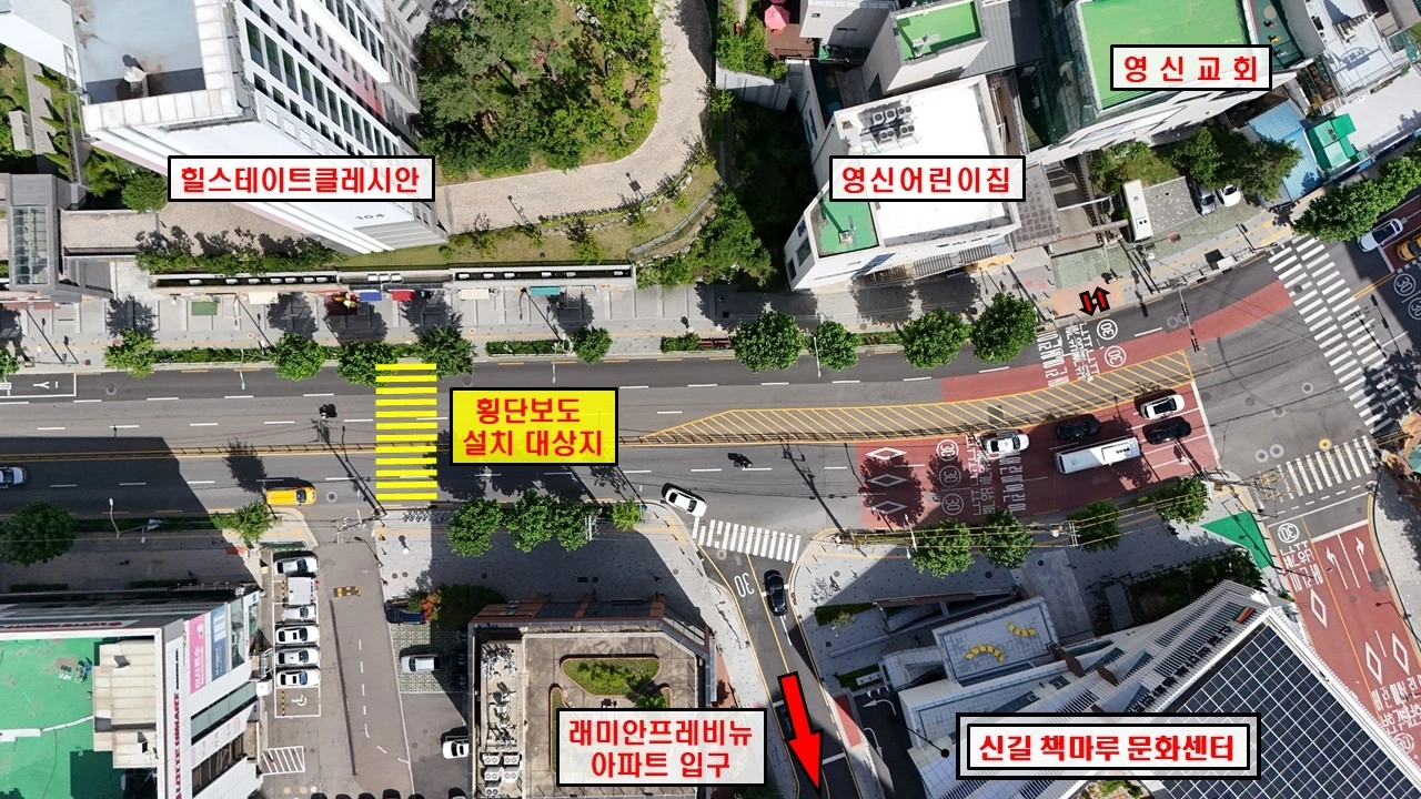 구는 보행 안전과 차량 흐름을 함께 고려한 횡단보도 신설을 목표로 주민 의견을 수렴해 검토에 착수했다. 영신어린이집 교직원과 학부모, 도서관 이용자, 인근 아파트 4개 단지 주민 등 여러 의견을 폭넓게 들었다. 이후 ▲보행자 이동 동선과 횡단 행태 ▲차량 통행량과 주행 속도 ▲인근 교차로와 기존 횡단보도와의 거리 등을 종합 분석해 여러 후보지를 놓고 설치 가능성을 검토했다.