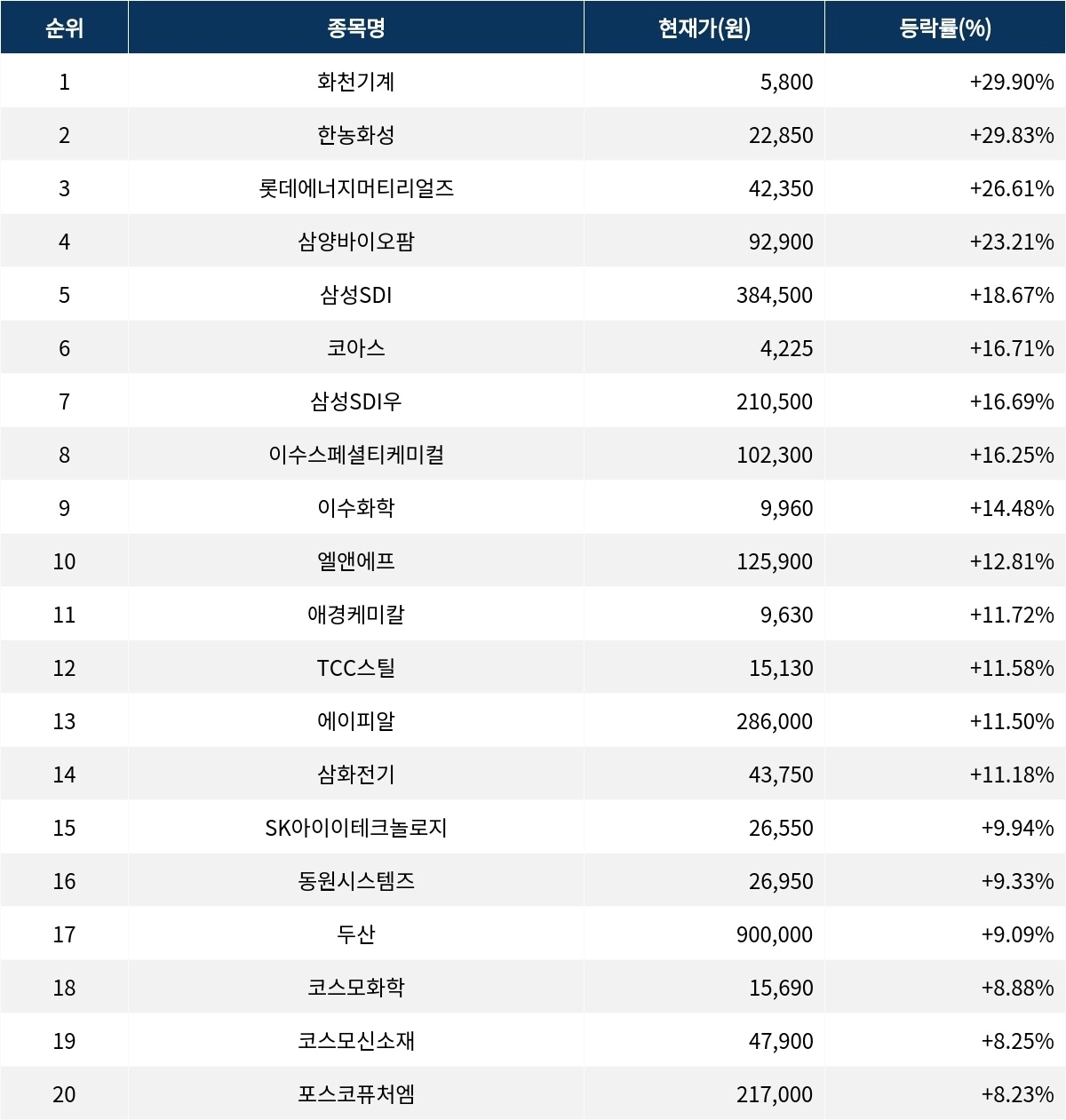 이어 상승률 2위 한농화성(011500)은 주가가 29.83% 폭등하며 종가 22,850원에 상승 마감했다. 상승률 3위 롯데에너지머티리얼즈(020150)의 주가는 42,350원으로 26.61% 폭등하며 두각을 나타냈다. 상승률 4위 삼양바이오팜(0120G0)은 23.21% 폭등하며 92,900원에 마감했다. 상승률 5위 삼성SDI(006400)는 18.67%의 급등세를 타고 종가 384,500원에 마감했다.