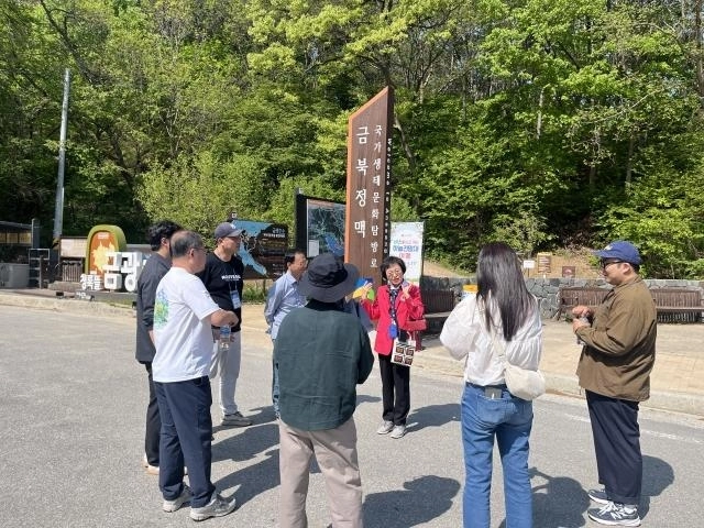 안성시 금북정맥에서 문화관광해설사가 관광객들에게 설명하고 있다. (안성시 제공)