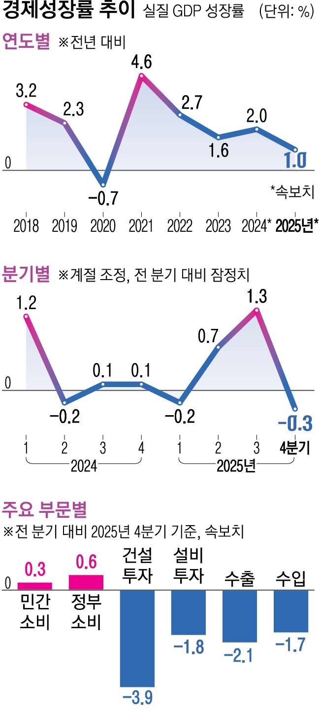 특히 4분기 성장률 -0.3%는 한은 전망치보다 0.5% 포인트 낮은 수치로 ‘어닝쇼크’(실적 충격) 수준이다. 분기 기준으로 GDP가 감소한 것은 3분기 만이고, 감소 폭으로는 2022년 4분기(-0.4%) 이후 가장 크다. 직전 분기 1.3%의 ‘깜짝 성장’에 따른 기저효과와 함께 건설경기 급락이 결정타였다.