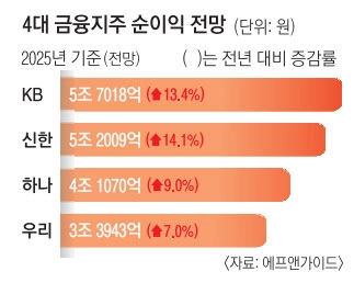 22일 금융정보업체 에프앤가이드에 따르면 KB·신한·하나·우리 등 4대 금융의 지난해 연간 당기순이익 합계는 18조 4040억원으로 추정된다. 2024년 16조 5268억원보다 11.4% 증가한 규모다. 최근 시장금리 상승과 고환율 영향으로 한 달 전 전망치(18조 5454억원)보다는 다소 낮아졌지만, 연간 기준으로는 역대 최대 실적 흐름을 이어갈 것으로 보인다.