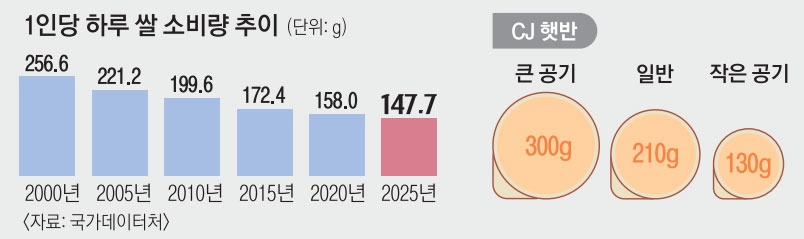 쌀 소비량은 1985년(128.1㎏) 이후 40년째 감소세를 이어가고 있다. 30년 전인 1995년(106.5㎏)과 비교하면 반토막이 났다. 하루 소비량으로 환산하면 1인당 147.7g으로, 시중에서 판매되는 즉석밥 ‘일반공기’(210g)의 약 70% 수준이다.
