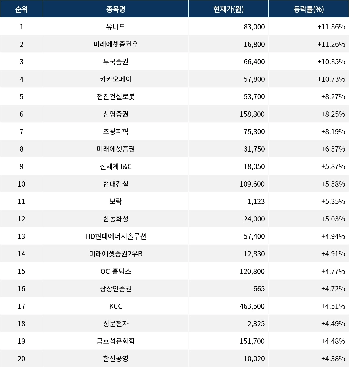 6위 신영증권(001720)은 현재가 158800원으로 8.25% 상승 중이다. 7위 조광피혁(004700)은 현재가 75300원으로 8.19% 상승 중이다. 8위 미래에셋증권(006800)은 현재가 31750원으로 6.37% 상승 중이다. 9위 신세계 I&C(035510)는 현재가 18050원으로 5.87% 상승 중이다. 10위 현대건설(000720)은 현재가 109600원으로 5.38% 상승 중이다.