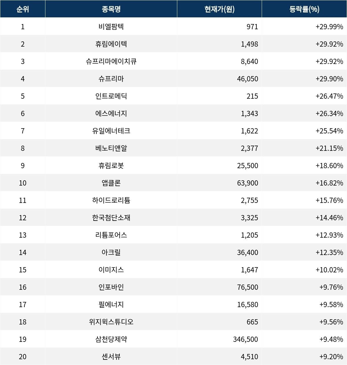 6위 에스에너지(095910)는 현재가 1343원으로 26.34% 상승 중이다. 7위 유일에너테크(340930)는 현재가 1622원으로 25.54% 상승 중이다. 8위 베노티앤알(206400)은 현재가 2377원으로 21.15% 상승 중이다. 9위 휴림로봇(090710)은 현재가 2만 5500원으로 18.60% 상승 중이다. 10위 앱클론(174900)은 현재가 6만 3900원으로 16.82% 상승 중이다.