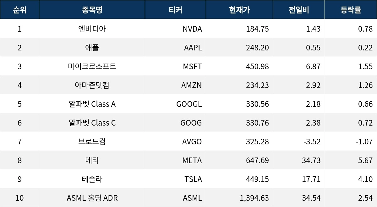 엔비디아는 0.78% 상승하며 184.75 달러로 거래를 마쳤다. 애플은 0.22% 상승하여 248.20 달러로 마감했다. 마이크로소프트는 1.55%의 상승률을 기록하며 450.98 달러에 거래됐다.