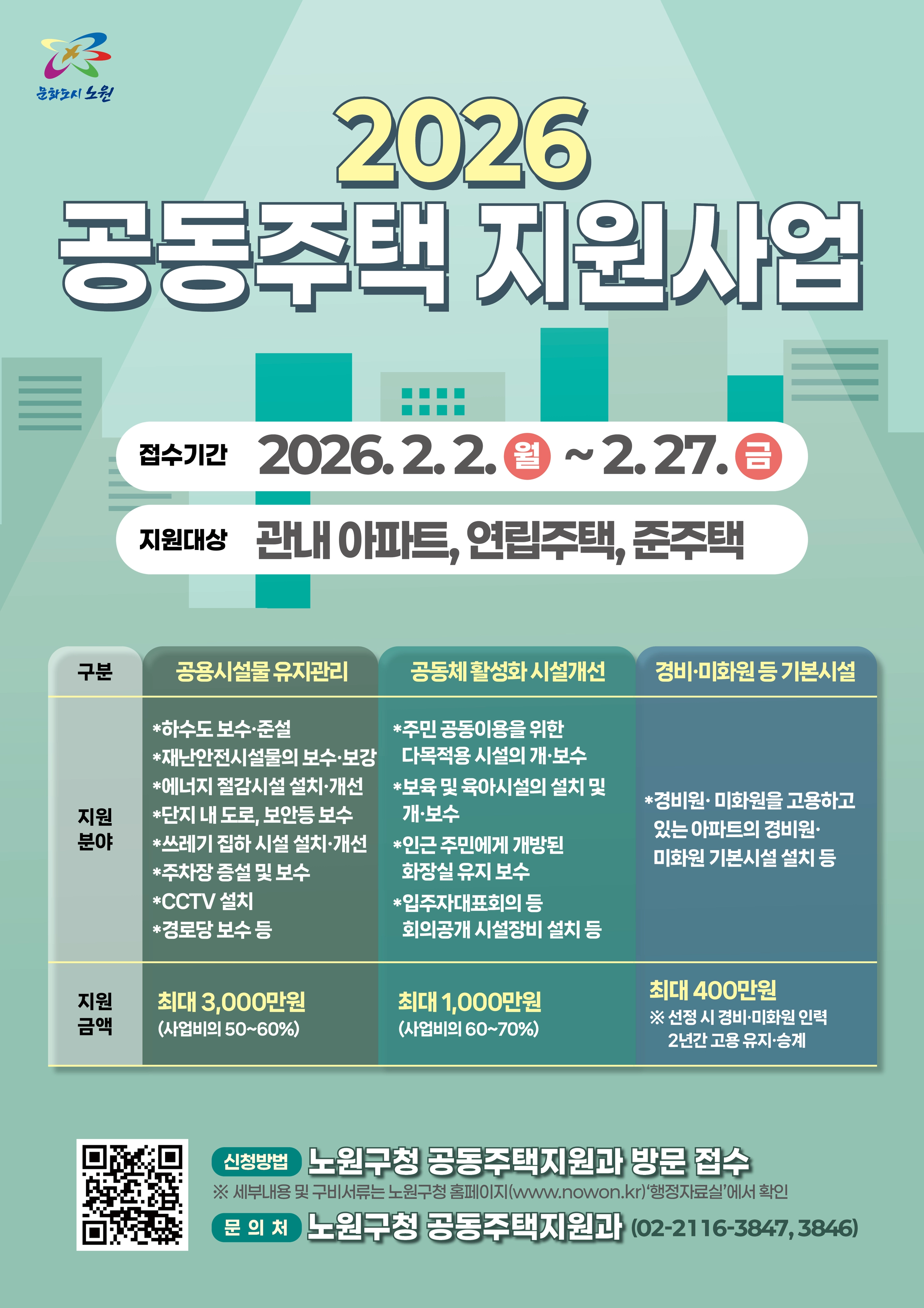 노원구 관계자는 “전체 주택의 약 80%가 공동주택인 지역 특성을 반영해, 시설 노후로 인한 유지·관리 부담을 줄이고 이웃 간 소통과 상생을 도모한다”고 설명했다.