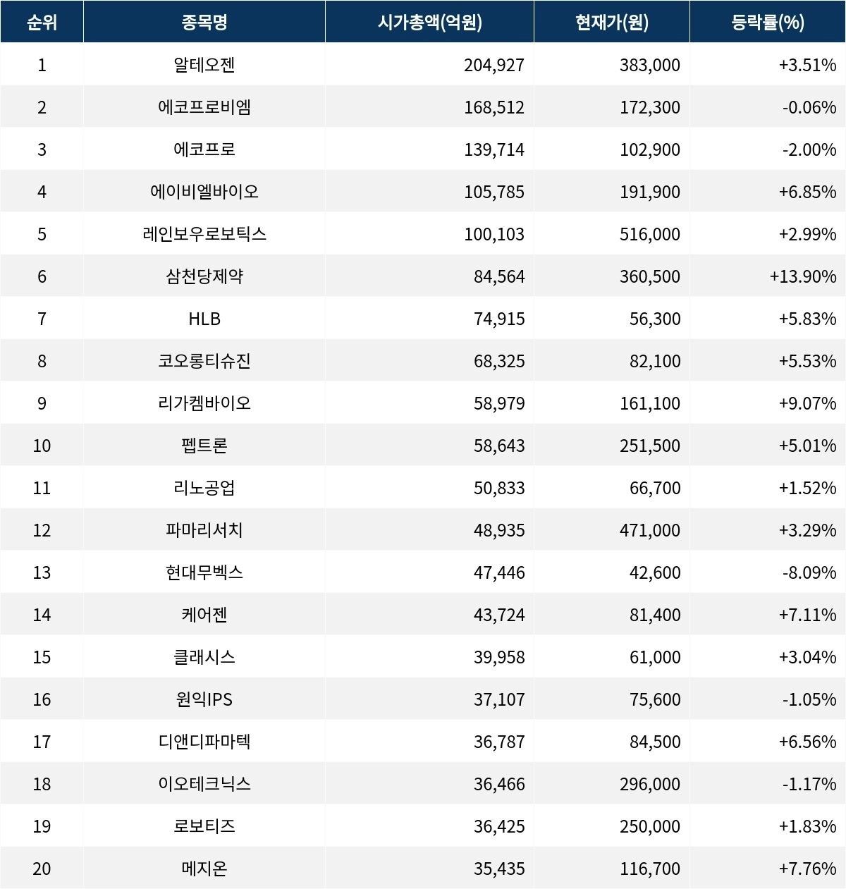 시가총액 3위부터 10위까지의 종목들 중에서는 에이비엘바이오(298380)가 6.85% 상승하며 두드러진 상승세를 보이고 있다. 이어 리가켐바이오(141080)가 9.07% 상승, 케어젠(214370)이 7.11% 상승하며 상승세를 기록하고 있다. 반면, 현대무벡스(319400)는 ▼8.09%로 가장 큰 하락폭을 기록하고 있다. 에코프로(086520) ▼2.00%, 원익IPS(240810) ▼1.05%, 이오테크닉스(039030) ▼1.17% 등 전반적인 하락세를 보여주고 있다.
