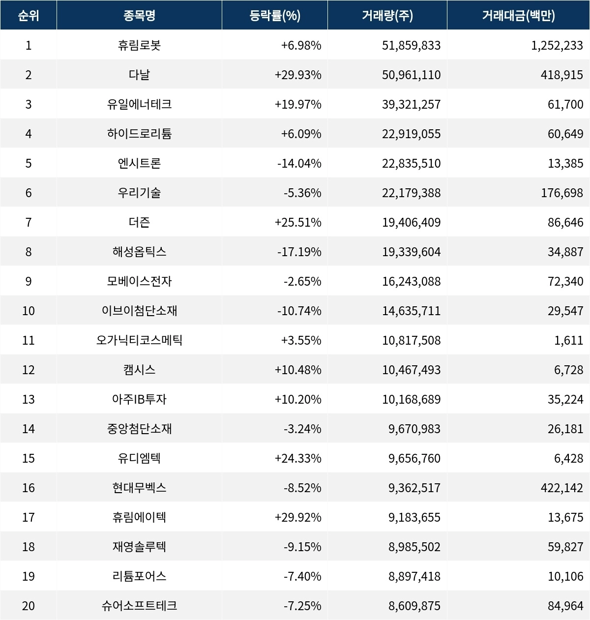 한편 거래량 상위 20위권 종목들은 오가닉티코스메틱(900300) ▲3.55%, 캠시스(050110) ▲10.48%, 아주IB투자(027360) ▲10.20%, 중앙첨단소재(051980) ▼3.24%, 유디엠텍(389680) ▲24.33%, 현대무벡스(319400) ▼8.52%, 휴림에이텍(078590) ▲29.92%, 재영솔루텍(049630) ▼9.15%, 리튬포어스(073570) ▼7.40%, 슈어소프트테크(298830) ▼7.25% 등의 성적을 기록했다.