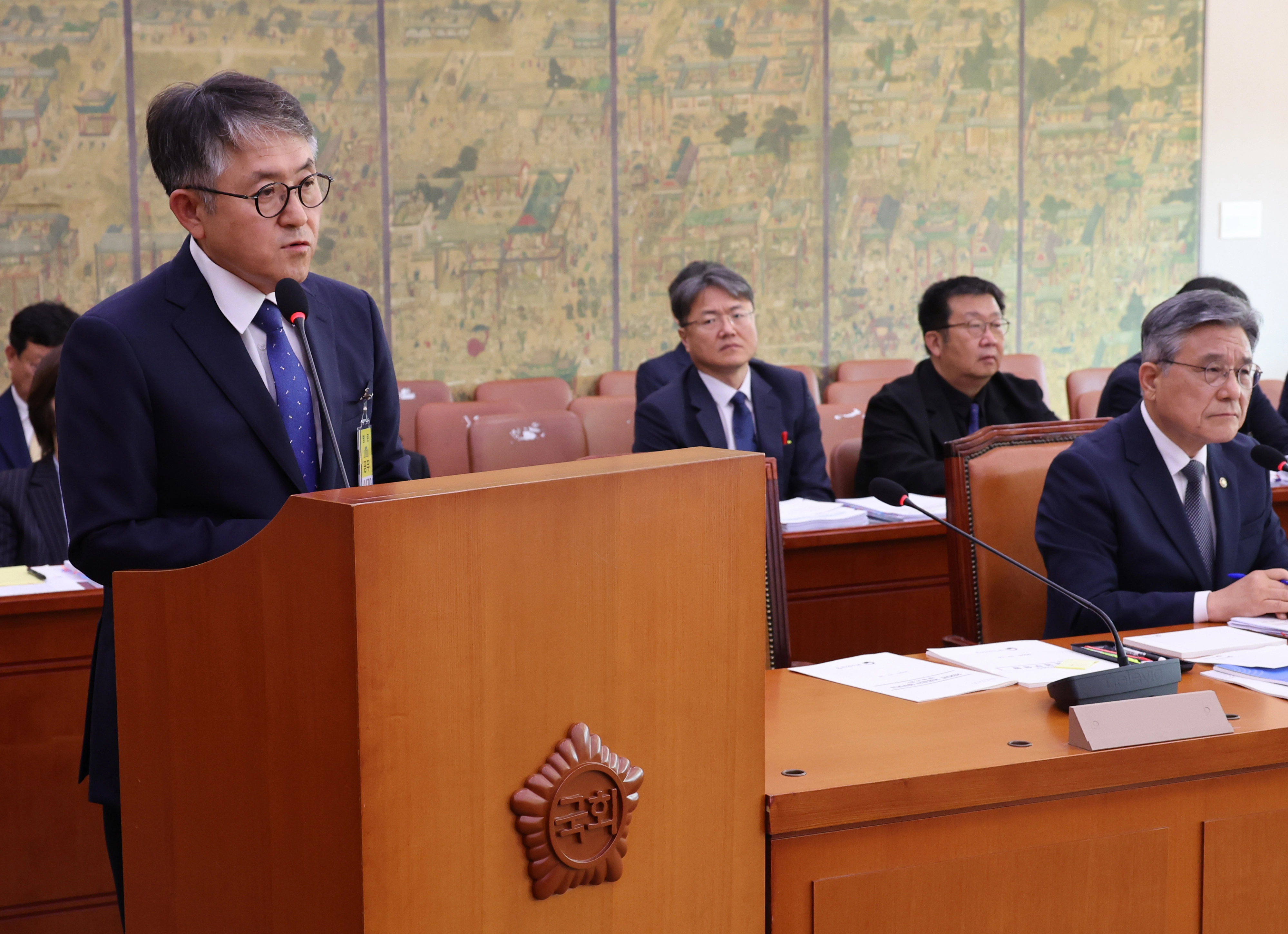 지난해 10월 이재필 궁능유적본부장이 서울 여의도 국회에서 열린 2025년도 국가유산청 등에 대한 문화체육관광위원회 국정감사에서 김건희 여사의 종묘 차담회 의혹과 관련한 의원들의 질의에 답하고 있다. 연합뉴스