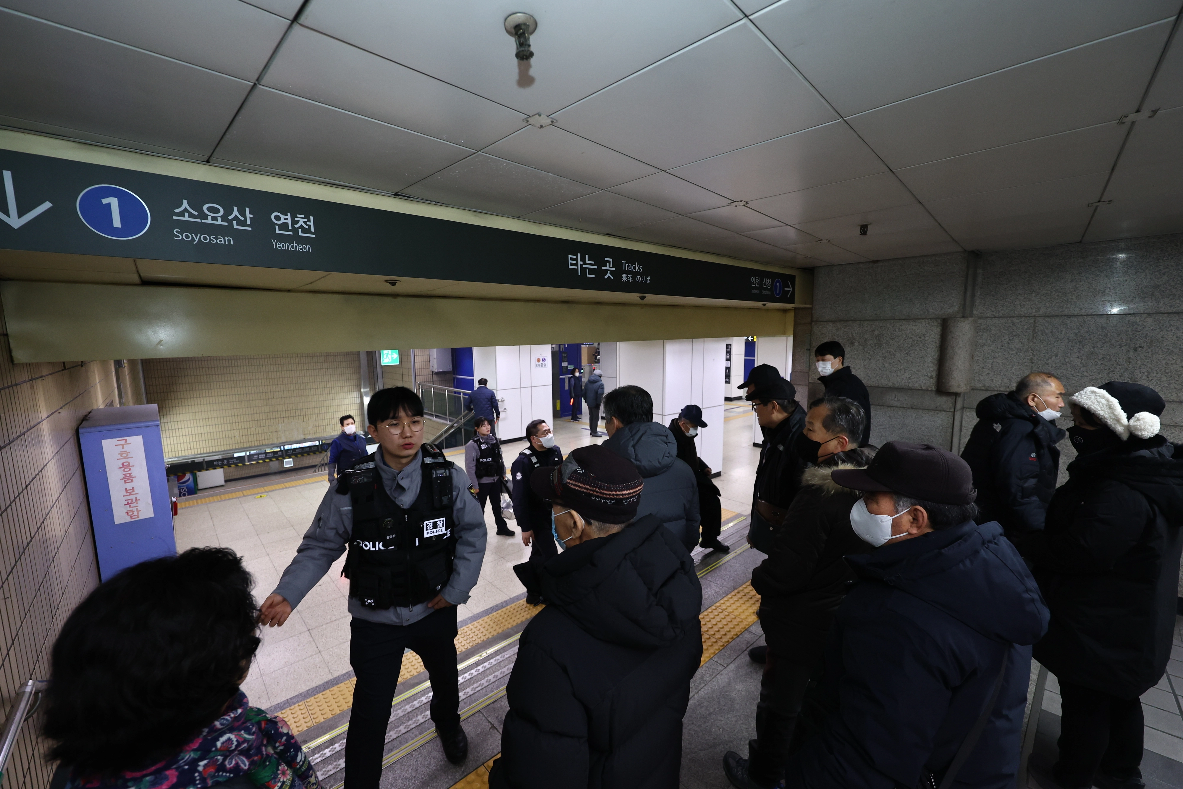 23일 오후 서울지히철 1호선 종로3가역에서 발생한 화재로 경찰이 승객의 승강장 진입을 통제하고 있다. 화재 영향으로 1호선 상행방면이 종로3가역을 무정차 통과중이다. 2026.1.23/뉴스1