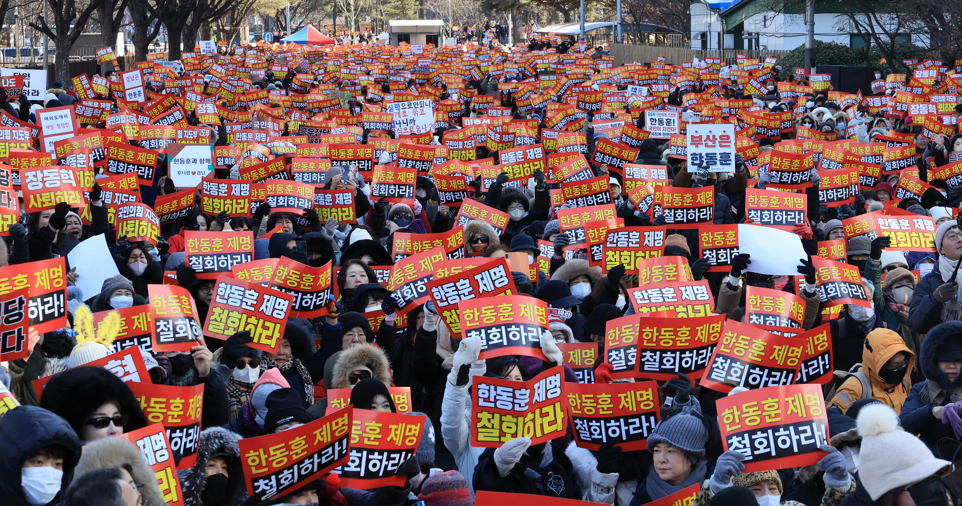 24일 서울 여의도에서 열린 한동훈 전 국민의힘 대표 지지자 집회에서 참석자들이 피켓을 들고 구호를 외치고 있다. 2026.1.24 연합뉴스