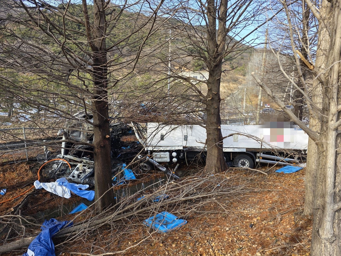 사고의 충격으로 화물차가 도로를 이탈한 뒤 화재가 발생했다.