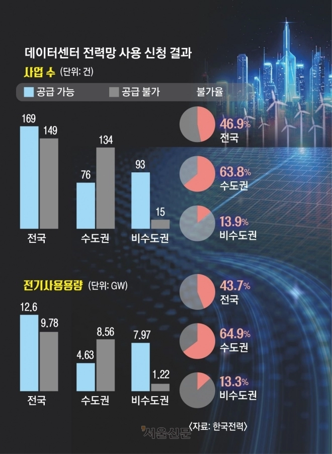 25일 한국전력에 따르면 전력계통영향평가 시범 운영을 신청(지난해 9월 기준)한 데이터센터 총 318건 가운데 149건(46.9%)이 전력 공급 불가 판정을 받았다. 수도권의 경우 210건 중 134건(63.8%)이 허가를 받지 못했다. 대규모 전력을 사용하는 데이터센터가 수도권에 집중되면서 기존 전력망의 한계를 넘어선 결과다.