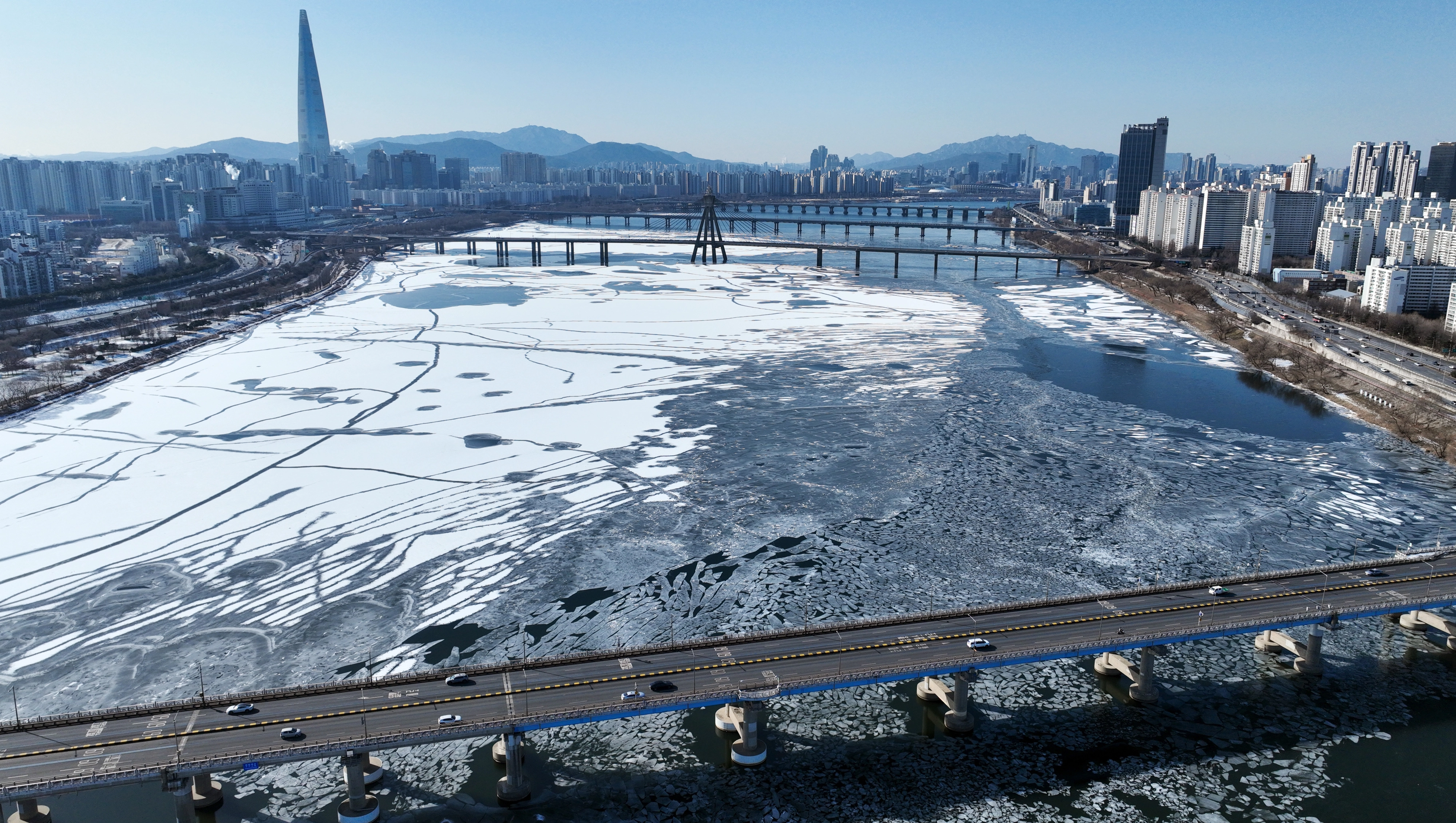 전국 대부분 지역의 아침 기온이 영하 10도 안팎으로 떨어지며 한파가 이어진 25일 서울 광나루한강공원 선착장 인근 강물이 얼어있다. 홍윤기 기자